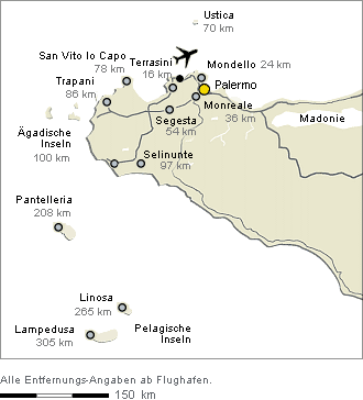 Fahrzeit über Autobahn und durch die Stadt zum und vom Hauptbahnhof ca. 45 Minuten, Preis 4.65 €Mit dem Taxi (Tel: 091-7020222) können Sie für ca. 30.- € zum Hauptbahnhof fahren, ca. 30 Minuten dauert die Fahrt. Von dort aus bringt Sie etwa stündlich ein Zug nach Cefalù, der letzte fährt um 21 Uhr ab Palermo