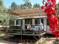Eine große, fest verankerte Holzterrasse lädt nicht nur im Sommer zum Draußen sitzen ein, das Zeltdach dafür ist im Preis inbegriffen. Das Mobile home ist mit ausreichend Schränken und Regalen ausgestattet. Kissen, Bettdecken und Fenstervorhänge vervollständigen die Einrichtung.